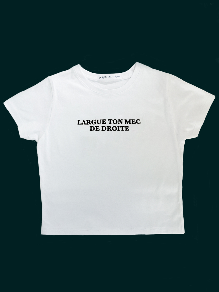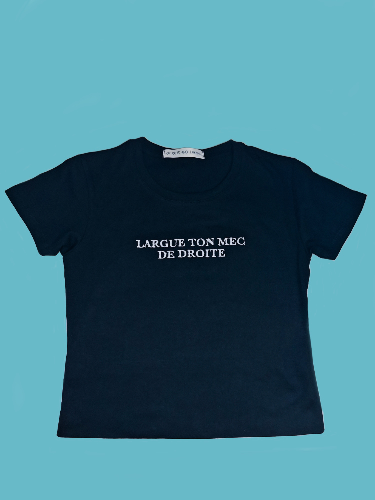 « Largue ton mec de droite« est brodé sur ce vêtement.